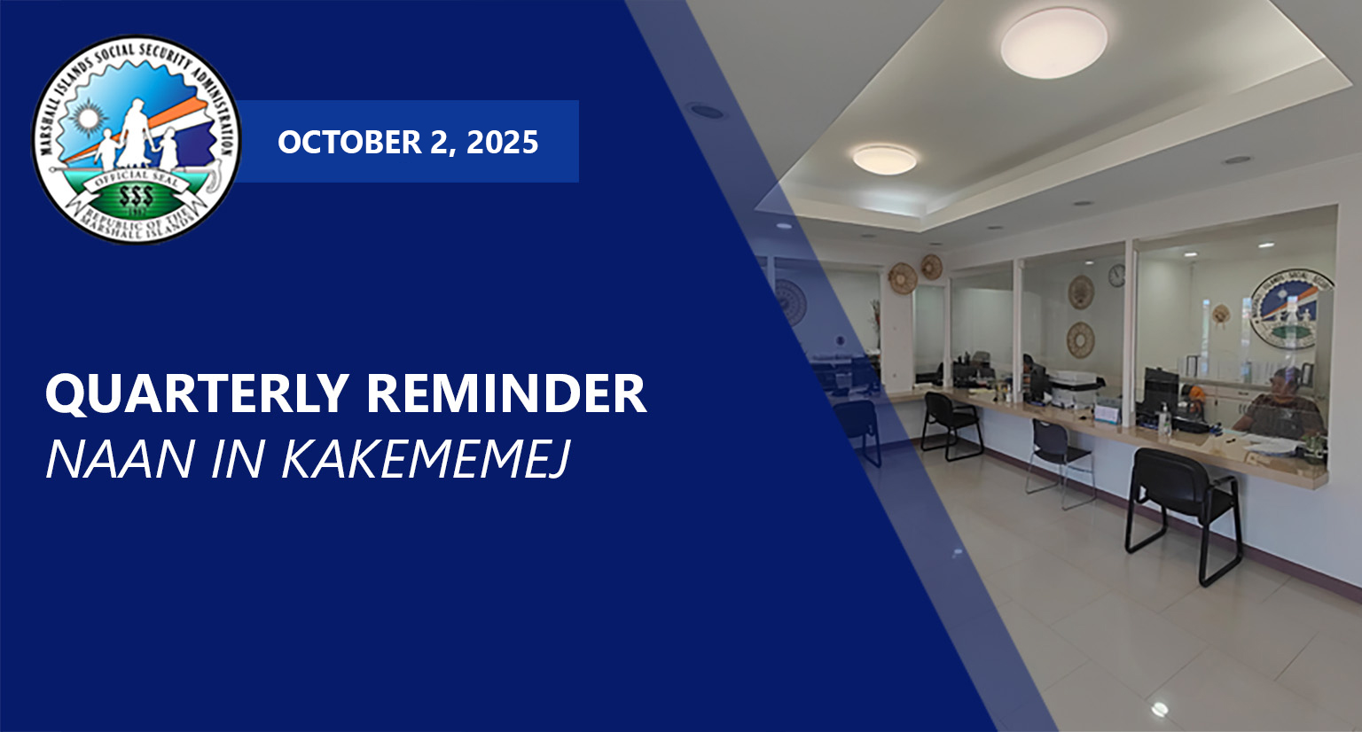 We would like to remind every employer and self-employed person, doing business within and outside the Republic of the Marshall Islands, that the deadline for filing quarterly Social Security Retirement and Health Fund contributions for the quarter ending September 30, 2025, will be on Friday, October 10, 2025. The MI-SS-3 form is available below: